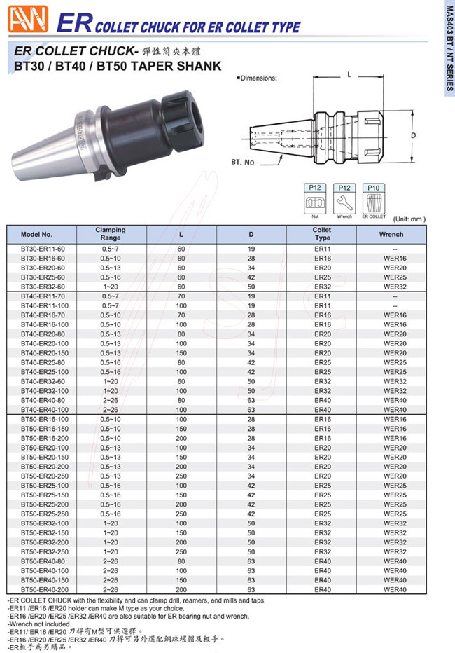 產(chǎn)品名稱: 安威刀柄系列--ER彈性筒夾本體BT30BT40BT50